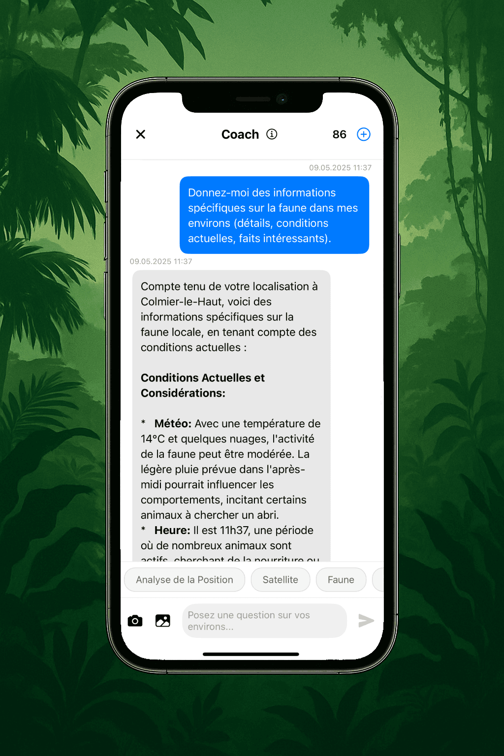 Identifiez instantanément des milliers d'espèces avec notre système de reconnaissance par IA et recevez des conseils personnalisés de votre guide nature IA. Le Coach Wildscope répond à vos questions sur votre environnement, fournit des conseils de sécurité et partage des connaissances fascinantes sur les espèces et écosystèmes locaux.